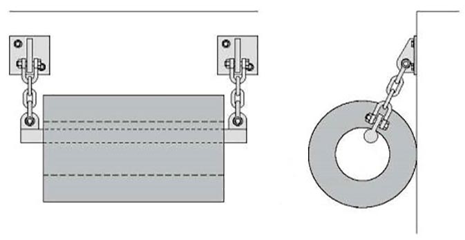 Кранцы причальные монтируются с использованием подвесных цепей, стальных стержней, а также могут устанавливаться с применением опорных элементов со стальным каркасом.
