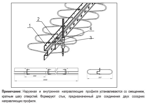 ОМЕГА-направляющие 1 (внутренняя и наружная). Скоба 2 предназначена для сопряжения омега-профиля с опорным винтом 4, с помощью которого ОМЕГА-профиль выставляется в вертикальной плоскости в зависимости от технических требований, предъявляемых к данному полу. Клин 3 предназначен для жёсткой фиксации в сопряжении «скоба – винт-опора» в сборе. Винт-опора 4 регулирует уровень ОМЕГА-профиля.